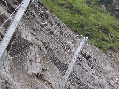 被動防護網是由鋼絲繩網、環形網、固定系統、減壓環和鋼柱四個主要局部構成。鋼柱和鋼絲繩網銜接組合構成一個整體,對所防護的區域構成面防護,從而阻止崩塌巖石土體的下墜,起到邊坡防護作用。